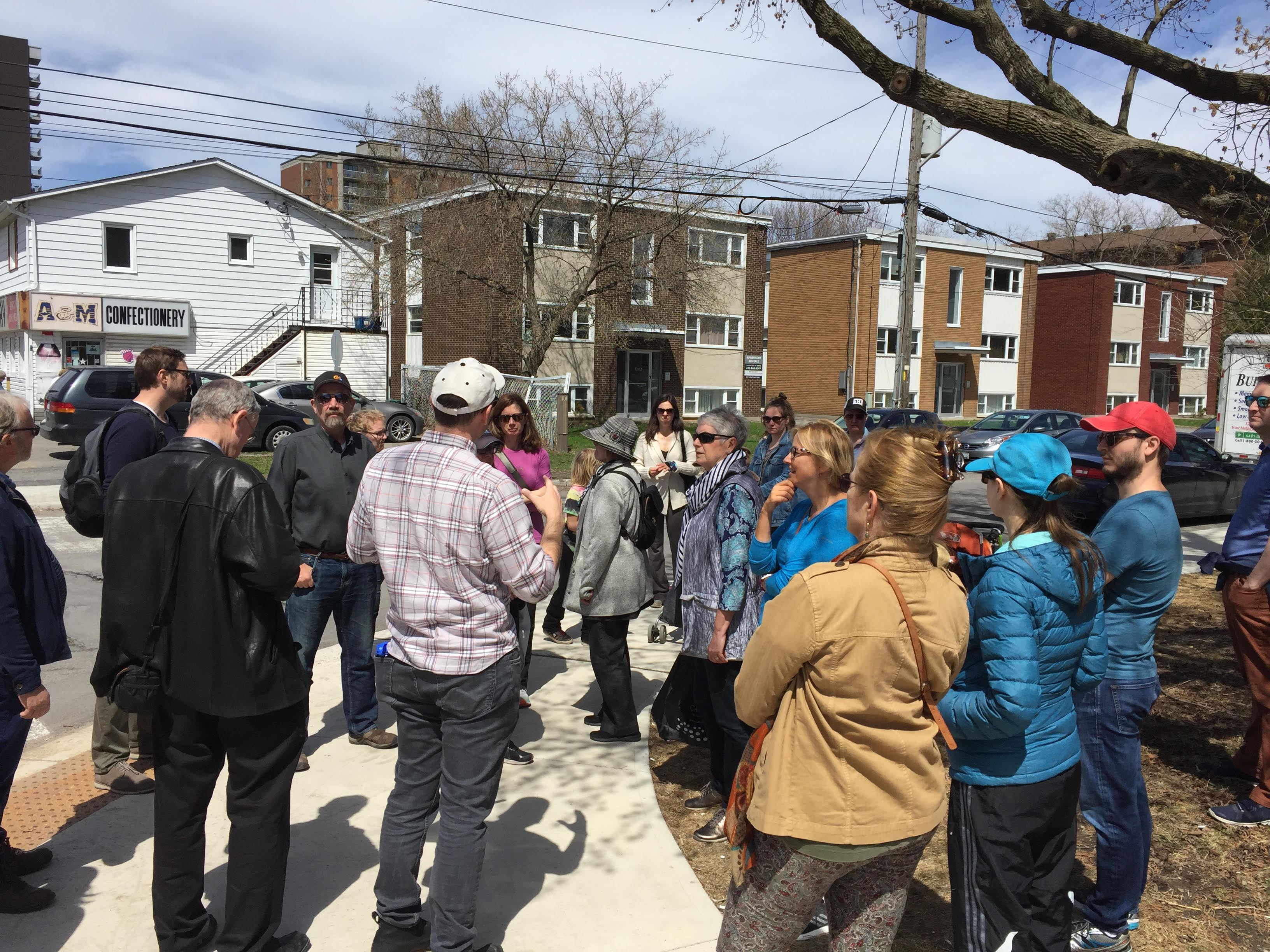 Over two dozen members of the Heron Park community met under blue skies to take part in Jane’s Walk on Saturday May 4. The group, lead by Planning and Development Committee members Reid and Mike, took to the streets of Heron Park by foot, discussing what the community might look like ten years from now.